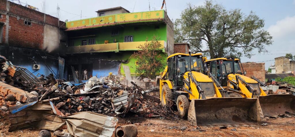 सूरजपुर। छत्तीसगढ़ के सूरजपुर जिले में प्रधान आरक्षक तालिब शेख की पत्नी मेहनाज शेख और बेटी आलिया शेख की जघन्य हत्या के मुख्य आरोपी कबाड़ी कुलदीप साहू और उसके परिवारजनों के आधा दर्जन से अधिक अवैध मकानों, प्रतिष्ठानों पर आज सोमवार को अलसुबह पुलिस और जिला प्रशासन की संयुक्त टीम ने बुलडोजर चलाने की कार्रवाई शुरू की। बड़ी संख्या में जवानों की मौजूदगी के साथ संबंधित इलाका छावनी में तब्दील हो गया है। आज सुबह जब लोग सोकर उठे तो कार्रवाई का पता चला। नगर पंचायत द्वारा संबंधितों को पूर्व में ही इस संबंध में नोटिस जारी किया गया था। शासन के निर्देश पर प्रशासन ने कब्जा हटाने कार्रवाई की तैयारी गुपचुप तरीके के पूरी कर ली गई थी। जिसकी लोगों को भनक तक नहीं लगी और आज तड़के आरोपी के सूरजपुर बाजारपारा स्थित प्रतिष्ठान से अतिक्रमण हटाने की कार्रवाई शुरू की गई।