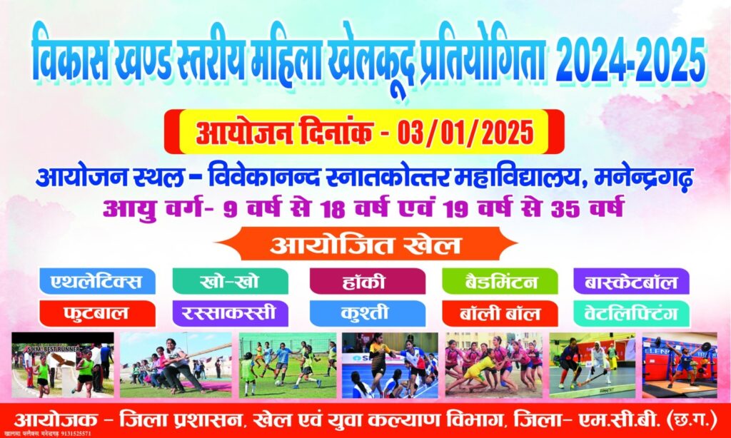 एमसीबी/(गुफरान खान )कलेक्टर डी. राहुल वेंकट और खेल अधिकारी गोपाल सिंह के निर्देशानुसार मनेंद्रगढ़ के शासकीय विवेकानंद स्नातकोत्तर महाविद्यालय के खेल प्रांगण में विकासखंड और जिला स्तर पर बालिका/महिला खेलकूद प्रतियोगिता का आयोजन किया जाएगा। विकासखंड स्तर की प्रतियोगिता 03 जनवरी 2025 को तथा जिला स्तर की प्रतियोगिता 04 जनवरी 2025 को आयोजित होगी। प्रतियोगिता में खो-खो, फुटबॉल, बास्केटबॉल, वॉलीबॉल, वेटलिफ्टिंग, रस्सा-कस्सी, हॉकी, कुश्ती, बैडमिंटन और एथलेटिक्स जैसे खेलों की स्पर्धाऐं आयोजित की जाएंगी।