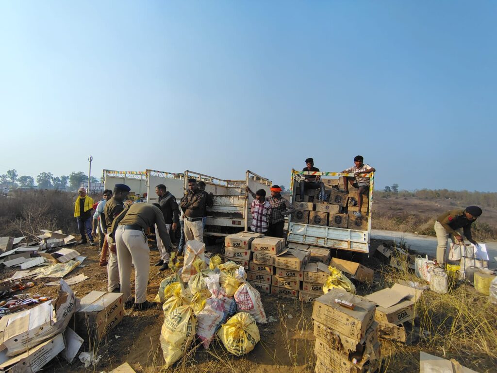 एमसीबी(गुफरान खान ) कलेक्टर एवं जिला दण्डाधिकारी डी. राहुल वेंकट के आदेश के परिपालन में विगत दिवस गठित समिति के सदस्य, पत्रकार, वीडियोग्राफर समय 11ः30 पूर्वान्ह छत्तीसगढ़ आबकारी अधिनियम 1915 की धारा 34 (2) के अन्तर्गत पुलिस विभाग द्वारा दर्ज प्रकरण में जब्त मदिरा के नष्टीकरण हेतु उपस्थित हुये। जब्त मदिरा नष्टीकरण हेतु ग्राम चैनपुर स्थित पुराना एसएलआरएम सेंटर का चयन किया गया। नष्टीकरण हेतु चयन भूमि ग्राम चैनपुर स्थित भूमि खसरा नम्बर 85/1 रकबा 35.582 हे. जो कि राजस्व अभिलेखों के अनुसार पहाड़ मद की शासकीय भूमि है। समय 12ः10 अपरान्ह नष्टीकरण की कार्यवाही प्रारंभ की गयी। सर्वप्रथम संबंधित थाना के थाना प्रभारी से दर्ज प्रकरण तथा प्रकरण के अन्तर्गत जब्त मदिरा (देशी/विदेशी) की सूची प्राप्त कर प्रकरणवार जब्त मदिरा (देशी/विदेशी) की मात्रा का भौतिक सत्यापन किया गया। भौतिक सत्यापन की प्रक्रिया पूर्ण होने के पश्चात् जब्त मदिरा (देशी/विदेशी) को जेसीबी में माध्यम से नष्ट किया गया। नष्टीकरण में थानावार केल्हारी से 5 प्रकरणों में 31 लीटर, झगराखांड़ से 28 प्रकरणों में 924.425 लीटर, कोटाडोल से 2 प्रकरणों में 13.86 लीटर, जनकपुर से 6 प्रकरणों में 97.84 लीटर, चिरमिरी से 36 प्रकरणों में 564.25 लीटर, खड़गवां से 59 प्रकरणों में 2828.82 लीटर, मनेंद्रगढ़ से 64 प्रकरणों में 3435.00 लीटर तथा पोंड़ी से 14 प्रकरणों में 3090.37 लीटर कुल 10985.57 लीटर मदिरा का नष्टीकरण किया गया। नष्टीकरण की प्रक्रिया के पश्चात् अवशेष (कांच के टुकड़े) का एक गड्ढा खोदकर अधोमृदित कर निराकरण किया गया। नष्टीकरण की सम्पूर्ण प्रक्रिया की वीडियोग्राफी की गयी तथा थानावार पंचनामा तैयार किया गया। नष्टीकरण की सम्पूर्ण कार्यवाही समय 6ः00 अपरान्ह को समाप्त की गयी। इस नष्टीकरण प्रक्रिया में अनुविभागीय अधिकारी (रा.) लिंगराज सिदार, अनुविभागीय अधिकारी पुलिस अलेक्सियुस टोप्पो, निरीक्षक थाना प्रभारी झगराखांड़ अमित कश्यप, निरीक्षक थाना प्रभारी जनकपुर दीपेश सौनी, निरीक्षक थाना प्रभारी चिरमिरी विवेक पटेल, उप निरीक्षक थाना प्रभारी पोंड़ी ओम प्रकाश दुबे, उप निरीक्षक थाना प्रभारी कोटाडोल गंगा साय पैकरा, उप निरीक्षक थाना प्रभारी केल्हारी टीकेश्वर यादव, उप निरीक्षक थाना प्रभारी खड़गवां आर.एन. गुप्ता, उप निरीक्षक थाना प्रभारी मनेंद्रगढ़ सुनील तिवारी शामिल रहे।