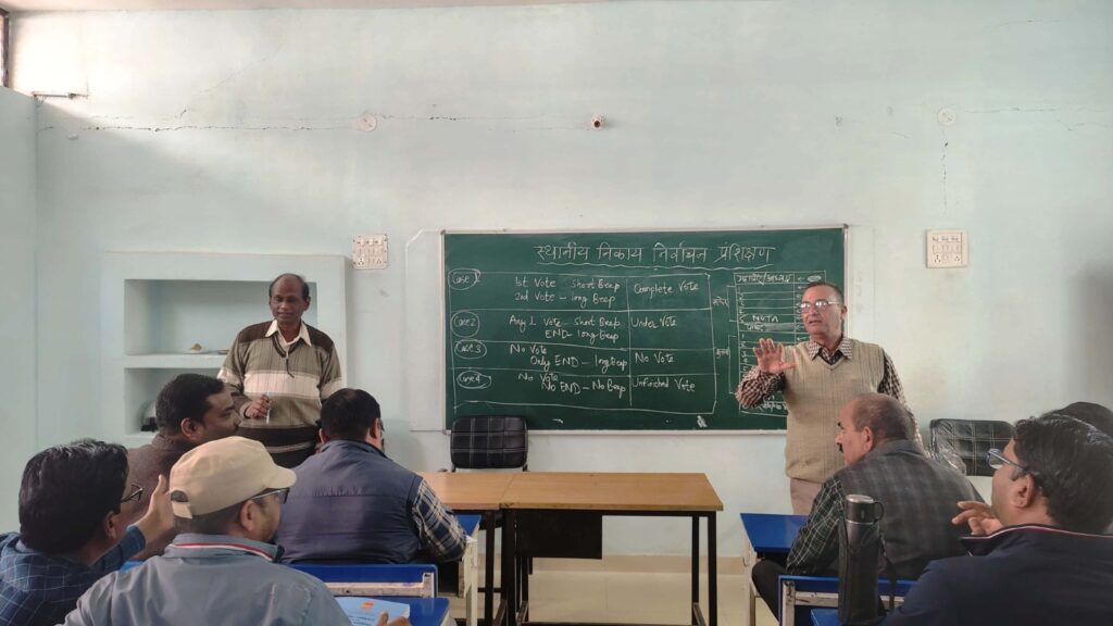 एमसीबी/ 23 जनवरी 2025/ कलेक्टर एवं जिला निर्वाचन अधिकारी डी. राहुल वेंकट के निर्देशन में आगामी नगरीय निकाय एवं त्रिस्तरीय पंचायत निर्वाचन 2025 की खड़गवां, मनेंद्रगढ़ और भरतपुर की मतदान दलों के प्रशिक्षण के लिए 78 मास्टर ट्रेनरों का प्रशिक्षण स्वामी आत्मानंद स्कूल मनेन्द्रगढ़ में सफलतापूर्वक संपन्न हुआ। मास्टर ट्रेनर टी. विजय गोपाल राव एवं वेद प्रकाश मिश्रा ने प्रशिक्षण के दौरान ईवीएम सेट के माध्यम से दो पदों पर मतदान प्रक्रिया को विस्तार से समझाया। उन्होंने बताया कि एक मतदान यूनिट में 16 पैनल का होता है। पहले पैनल में महापौर/अध्यक्ष पद के नाम का उल्लेख किया जाएगा, इसके बाद के पैनलों में अभ्यर्थियों के नाम, फोटो और निर्वाचन प्रतीक होंगे। अंतिम अभ्यर्थी के बाद के पैनल में “उपर्युक्त में से कोई नहीं“ (NOTA) का प्रावधान रहेगा। दूसरे पद (पार्षद) के लिए भी इसी प्रकार पैनलों का विवरण रहेगा। यदि महापौर/अध्यक्ष के लिए पांच अभ्यर्थी हैं, तो पैनल दो से छः तक इनके लिए होंगे, और सातवां पैनल NOTA के लिए होगा। इसी प्रकार पार्षद पद के लिए आठवें पैनल से प्रारंभ होगा और 15वां पैनल NOTA के लिए होगा। 16वां पैनल लाल रंग का एण्ड (END) बटन होगा, जिसे मतदान के लिए उपयोग नहीं किया जा सकता। यदि अभ्यर्थियों की संख्या अधिक है, तो अतिरिक्त मतदान यूनिट जोड़े जा सकते हैं, परंतु चार से अधिक नहीं। चार यूनिट के माध्यम से अधिकतम 56 अभ्यर्थियों के लिए व्यवस्था की जा सकती है, जिसमें पद, नाम, प्रतीक चिन्ह और NOTA पैनल शामिल हैं। प्रत्येक मतदाता को महापौर/अध्यक्ष और पार्षद पद के लिए अलग-अलग मतदान करने का अधिकार होगा। मतदान प्रक्रिया में, प्रत्येक पद के लिए अलग-अलग लेबल स्थापित किए जाते हैं। मतदाता अपनी इच्छा अनुसार संबंधित बटन दबाकर अपना मत अभिलिखित कर सकता है। यदि कोई मतदाता किसी भी अभ्यर्थी को मत नहीं देना चाहता, तो वह NOTA बटन दबाकर यह दर्ज कर सकता है। यदि कोई मतदाता केवल एक पद के लिए मतदान करता है और एण्ड (END) बटन दबाता है, तो इसे अंडर वोट (Under vote) माना जाएगा। यदि वह किसी भी बटन को दबाए बिना एण्ड (END) बटन दबाकर बाहर आता है, तो इसे नो वोट (NO VOTE) कहा जाएगा। वहीं, यदि किसी भी बटन को दबाए बिना मतदान कक्ष से बाहर आता है, तो इसे अनफिनिश्ड वोटर (Unfinished voter) माना जाएगा। सभी प्रकार के मतों का विवरण मतदान मशीन के नियंत्रण यूनिट में रिकॉर्ड किया जाएगा। इस प्रशिक्षण में खड़गवां, मनेंद्रगढ़ और भरतपुर के सभी मास्टर ट्रेनर उपस्थित थे।